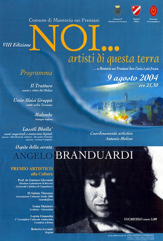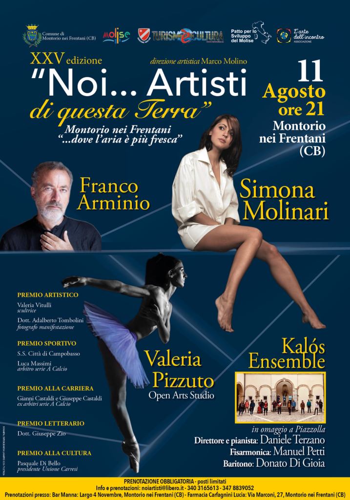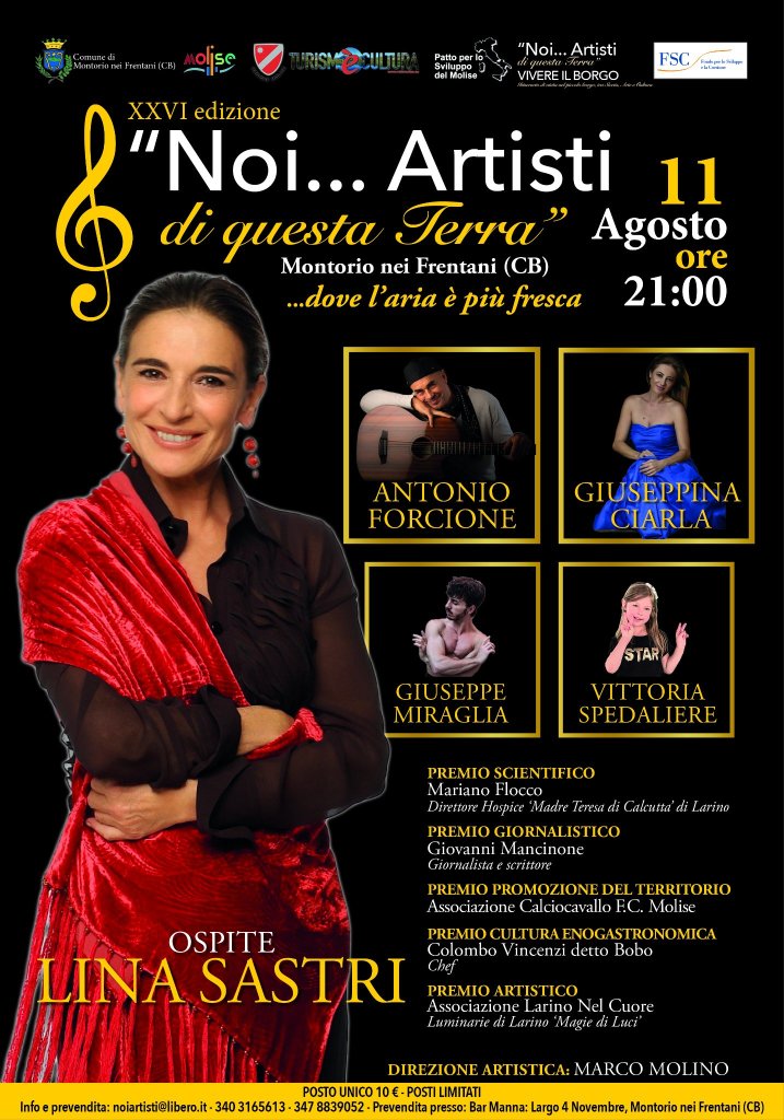 L’evento ‘Noi…Artisti di Questa Terra’ si svolge da 28 anni, senza soluzione di continuità, nel Comune di Montorio nei Frentani, borgo molisano nella provincia di Campobasso. ‘Noi… Artisti di Questa Terra’ è una delle manifestazioni artistiche più significative ed apprezzate del panorama artistico molisano. Con una consolidata storia alle spalle, l’evento negli anni ha permesso di tracciare una storia artistica della Regione Molise che assume un valore particolare per le nuove generazioni che colgono nell’evento la possibilità di incontrare dal vivo artisti e personalità del mondo della Cultura, intesa nelle diverse accezioni, di valenza locale, nazionale ed internazionale. L’Associazione, nella sua lunga vita, ha premiato oltre 1200 artisti locali e personalità di fama nazionale ed internazionale. Per citarne alcuni: Angelo Branduardi, Fred Bongusto, Fabrizio Moro, Inti-illimani, Nicola Piovani, Tosca, Ambrogio Sparagna, Lina Sastri, Franco Arminio, Simone Cristichhi, Simona Molinari, Vittorio Sgarbi, Balletto Nazionele Cubano, Balletto Nazionale Spagnolo, Elio Germano, Domenico Iannacone, Nanni Garella, Gilda Giuliani, Samantha Togni e Samuel Peron, Natalia Titova, Federica Carta, Sonhora.